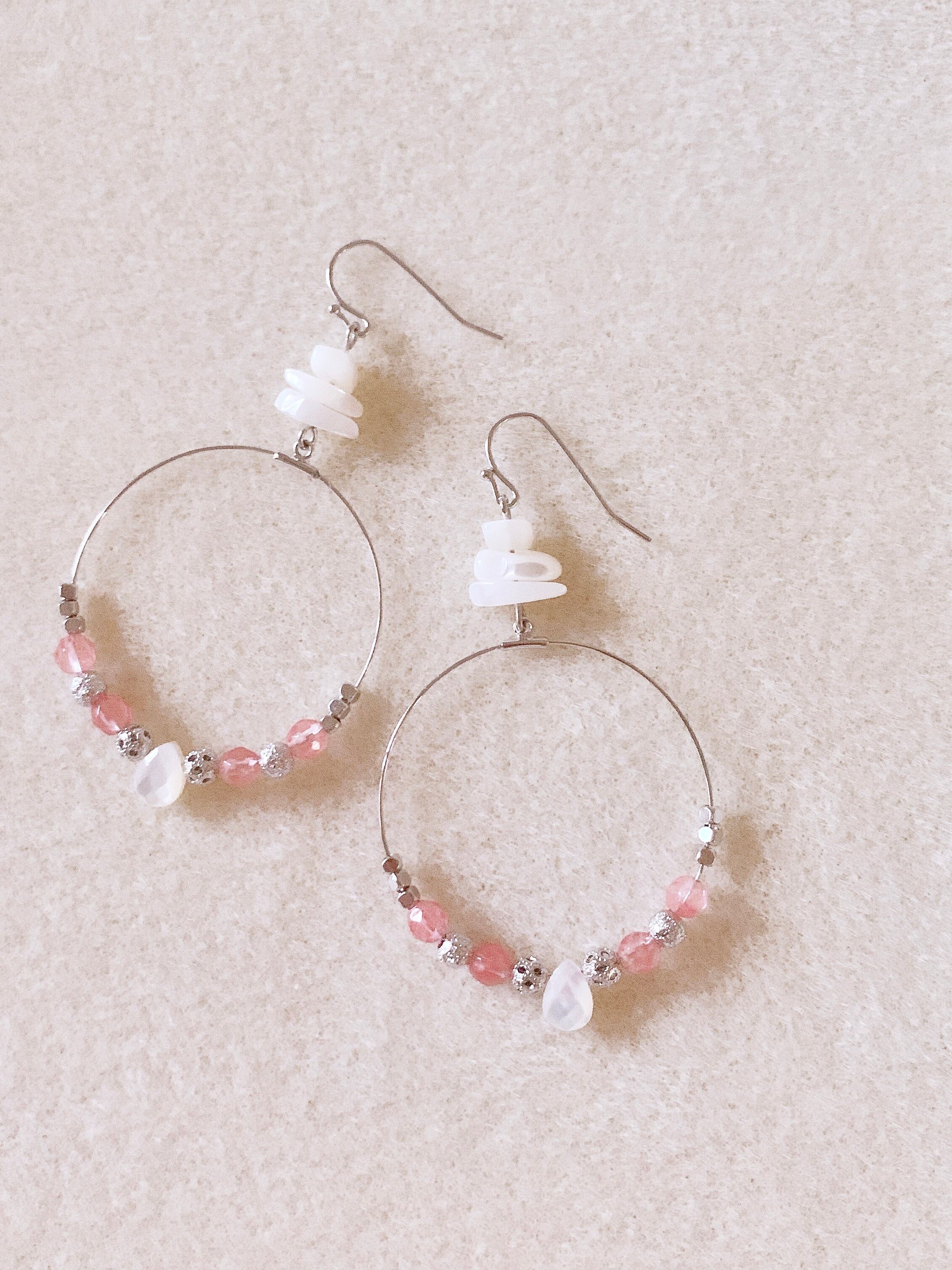 ・洋ナシの形にカットを加えたマザーオブパールに天然石を合わせた、やや大きめサイズのフープピアスです。