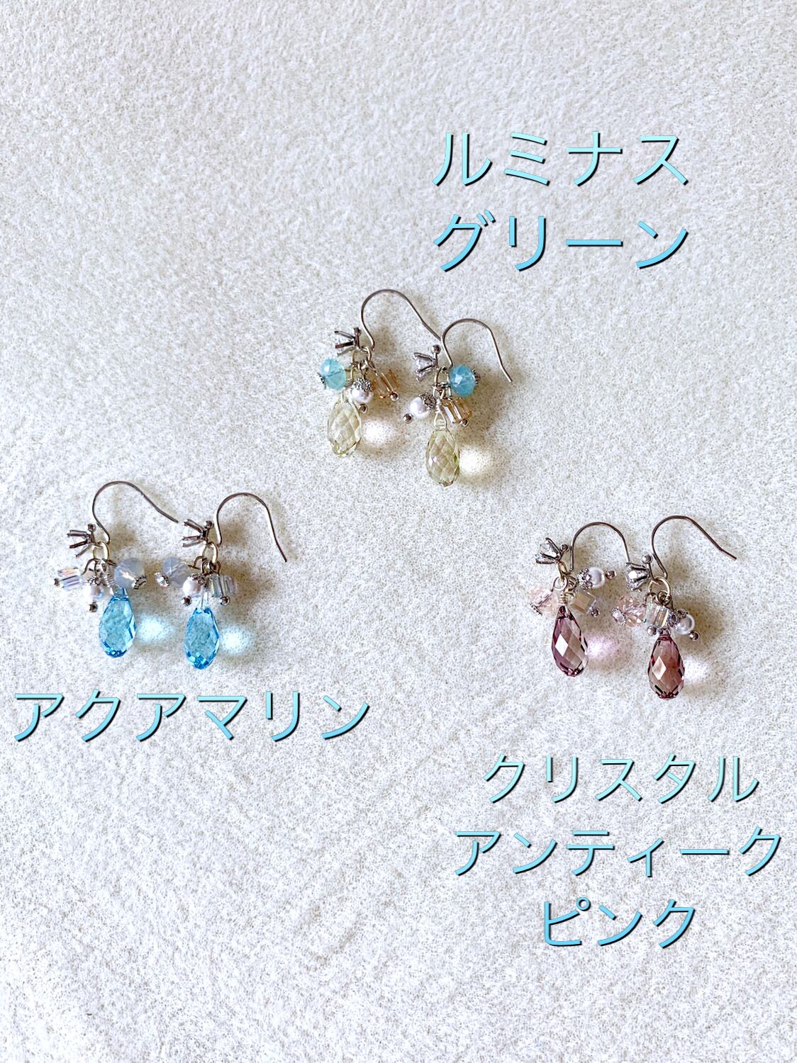 それぞれのメインの色に合わせた四角いクリスタルと楕円クリスタル、小粒パールを合わせました。