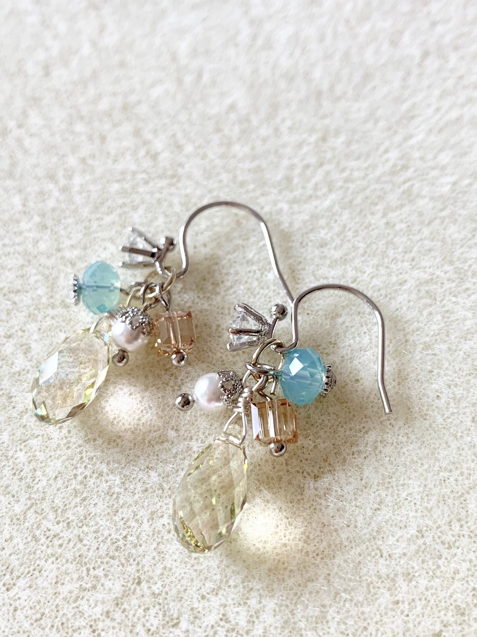 色んな形のスワロフスキークリスタルと小粒パールを組み合わせたフックタイプのピアスです。