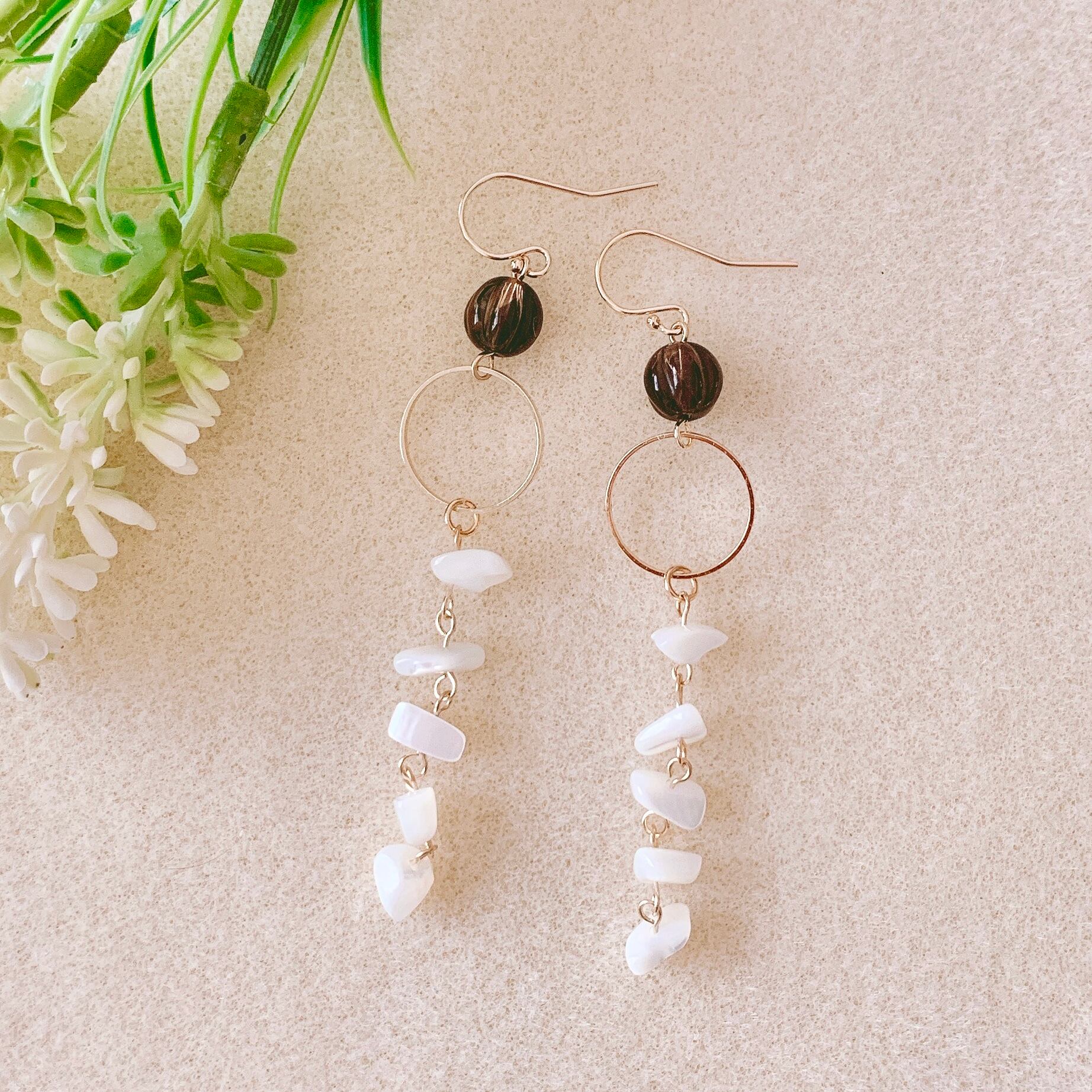 丸にスジの入ったスモーキークォーツと、マザーオブパールを合わせたロングピアスです。