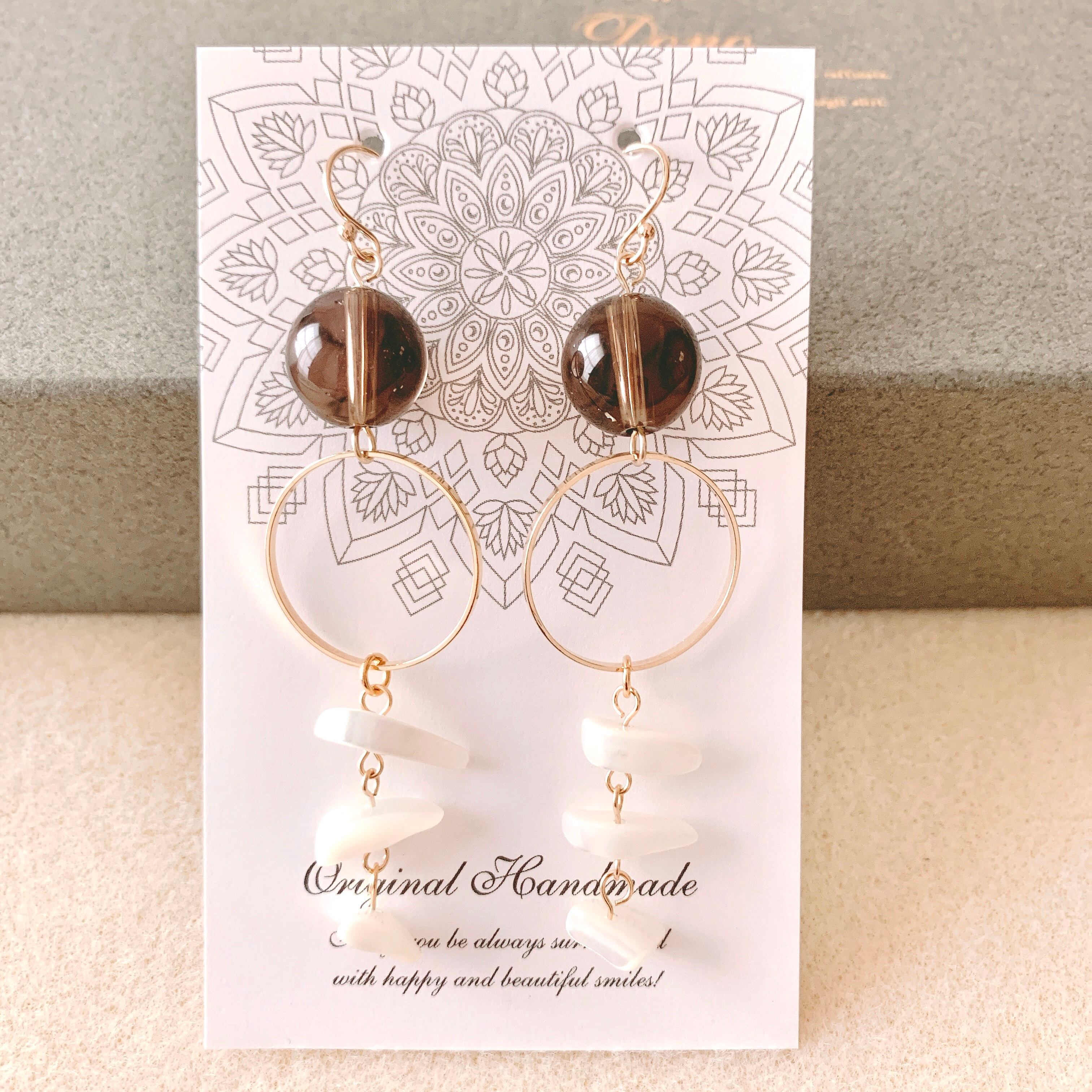 まん丸で透明感のあるスモーキークォーツと、マザーオブパールを合わせたピアスです。