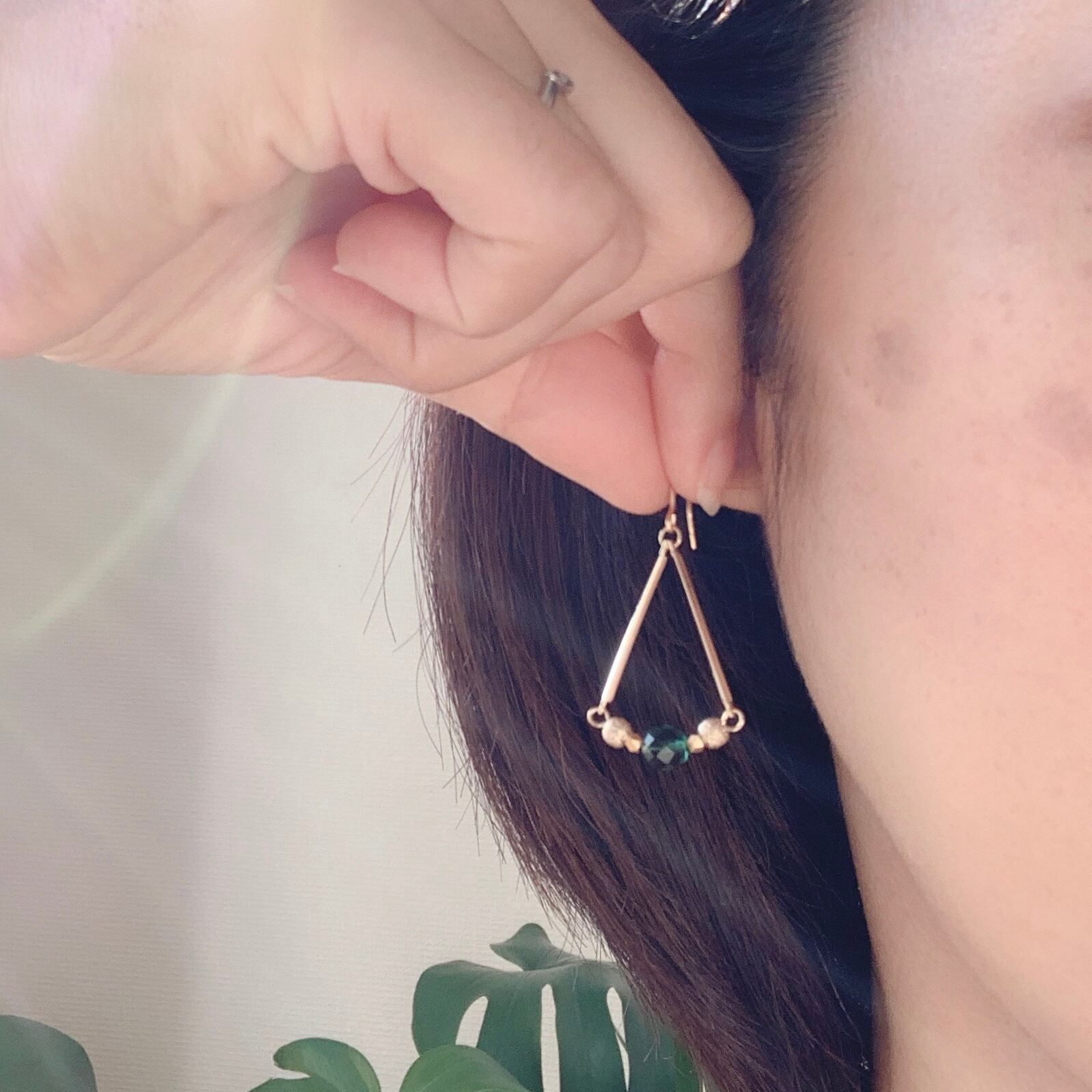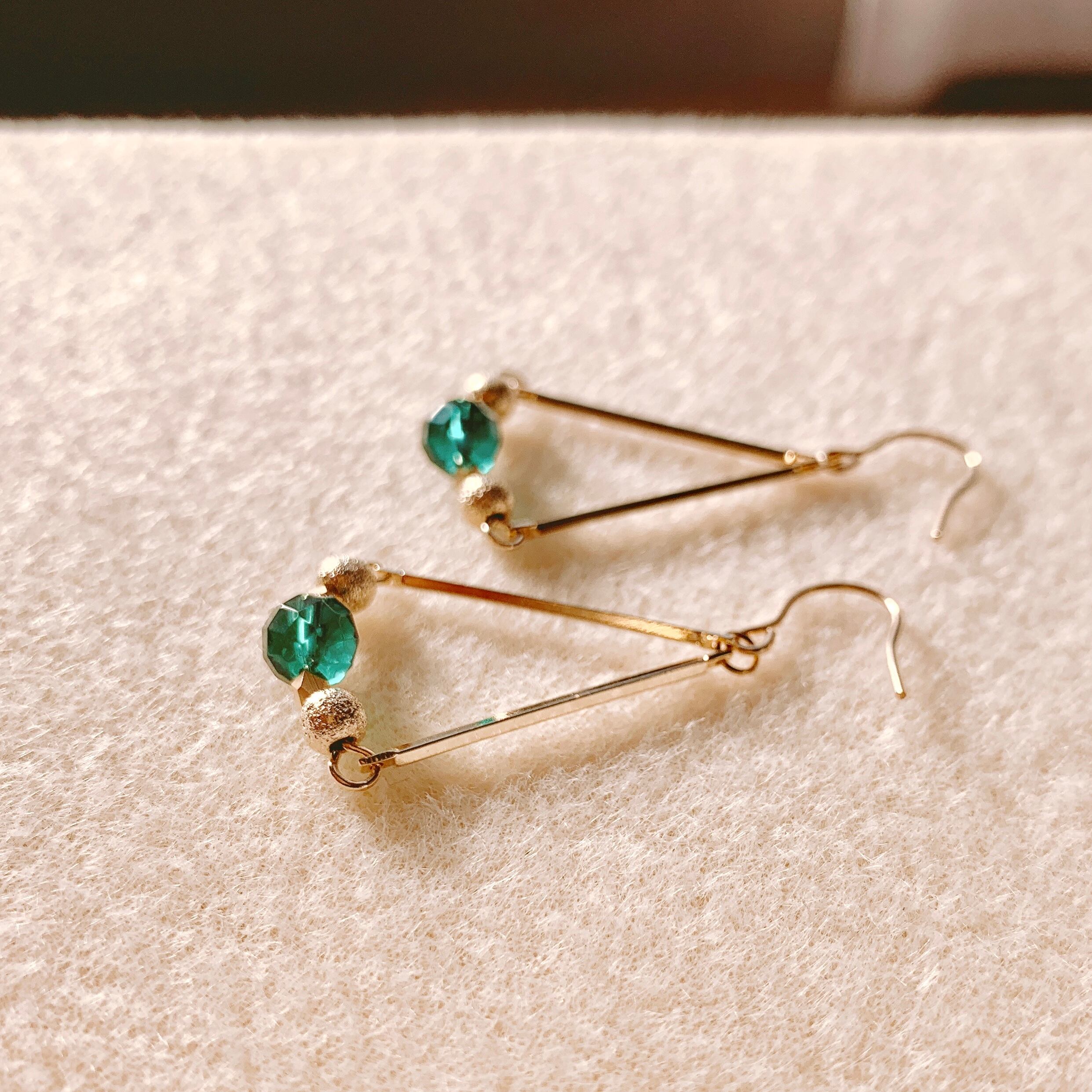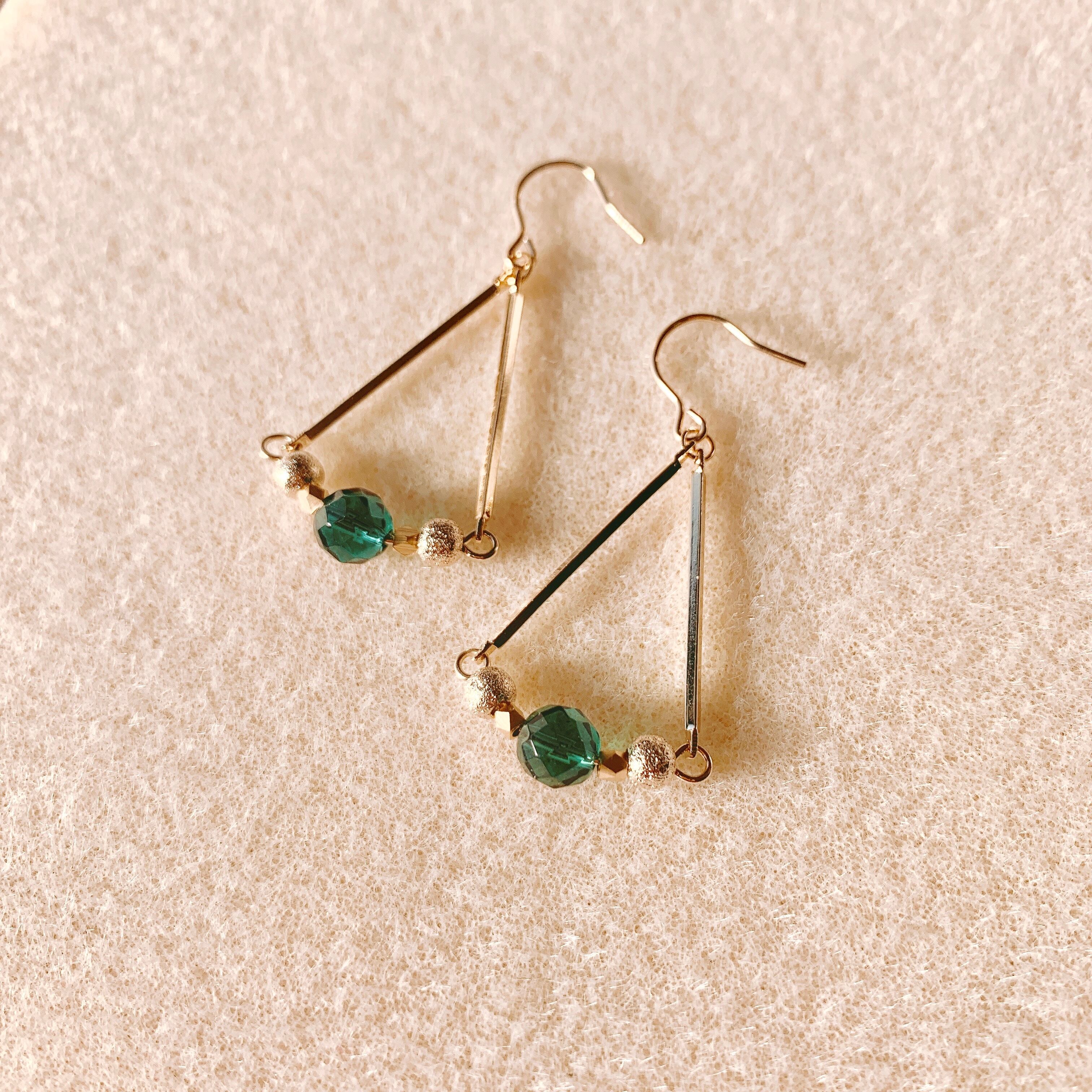 深い緑色の水晶を主役にした、オリエンタルな雰囲気のピアスです。