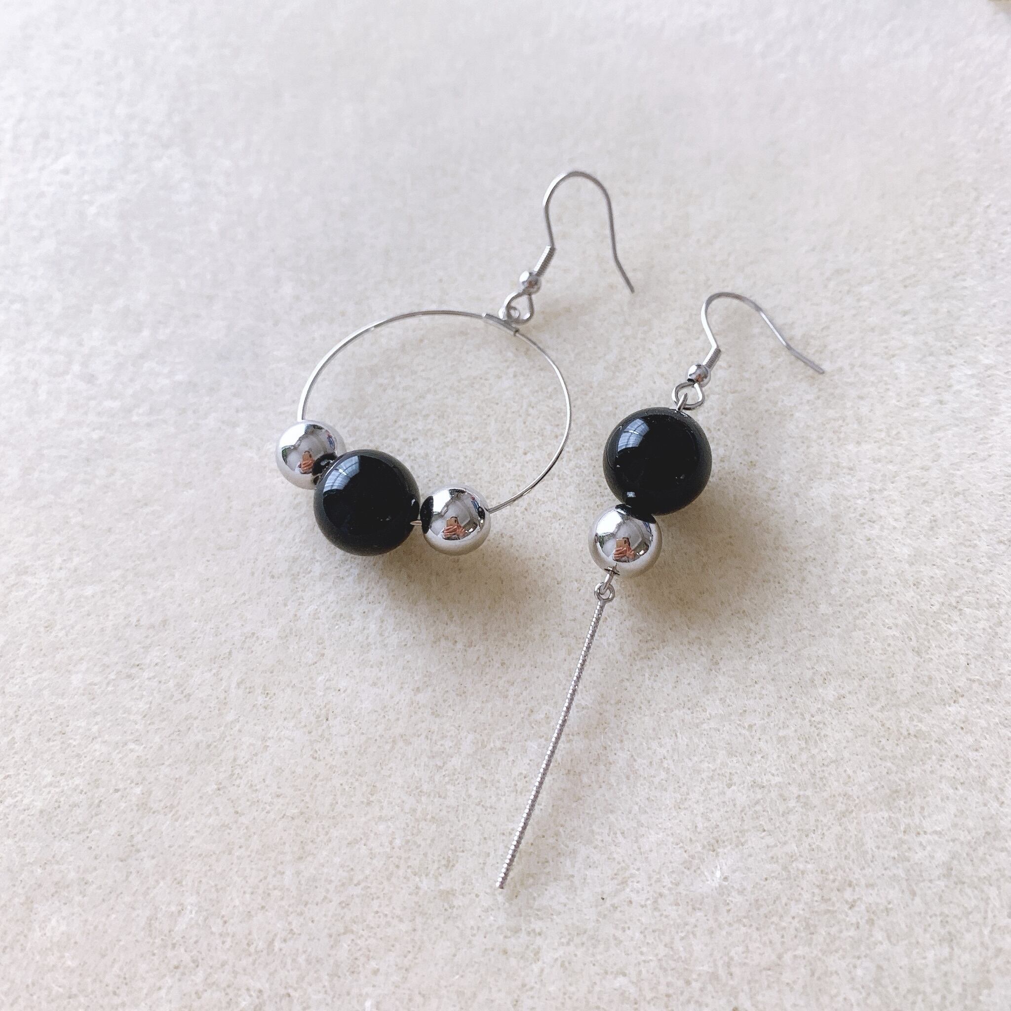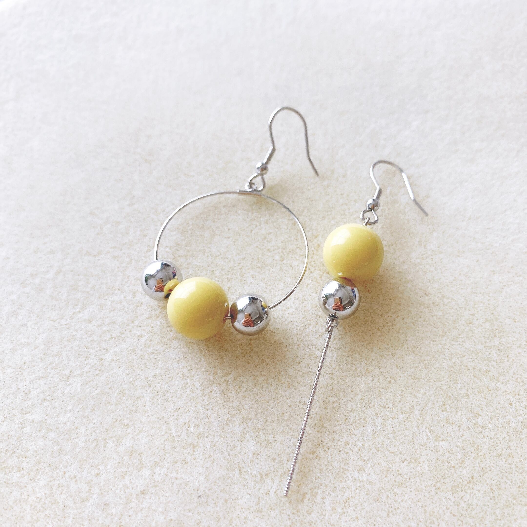 アクリルボールを中心に、シルバーカラーの丸玉を合わせた、アシンメトリーピアスです。
