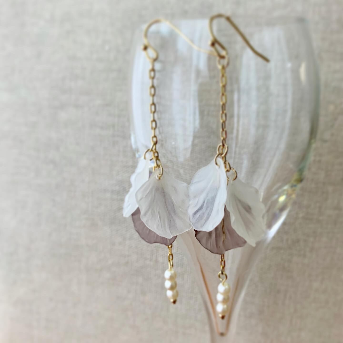 ホワイトとグレーの花びらが淡く重なるピアスです。コットンパール風の小粒パールを3つ、チェーンの先につないだ、優しく揺れるデザインです。